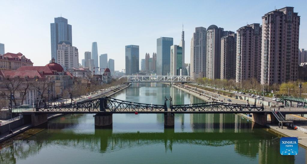 Aerial photo taken on March 27, 2022 shows bridges over the Haihe River in north China's Tianjin. (Xinhua/Sun Fanyue)