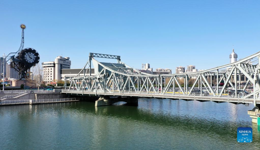 Aerial photo taken on March 27, 2022 shows the Jiefang bridge over the Haihe River in north China's Tianjin. (Xinhua/Li Ran)