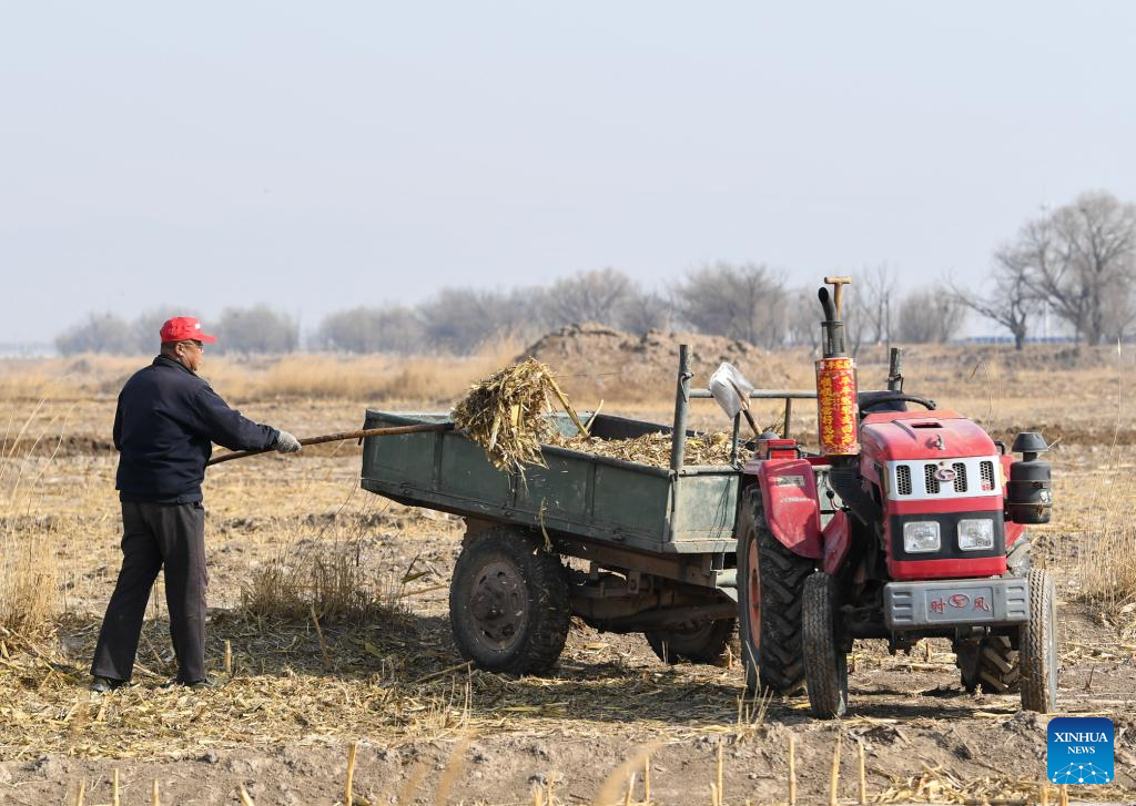 A farmer removes straw from a field in Hohhot, north China's Inner Mongolia Autonomous Region, March 30, 2022. (Xinhua/Peng Yuan)