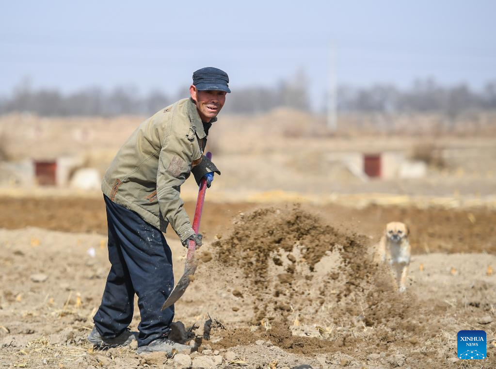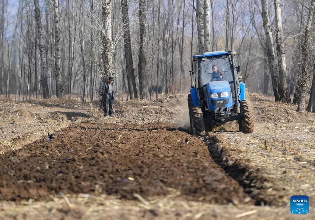 A farmer loosens soil with a machine in Hohhot, north China's Inner Mongolia Autonomous Region, March 30, 2022. (Xinhua/Peng Yuan)