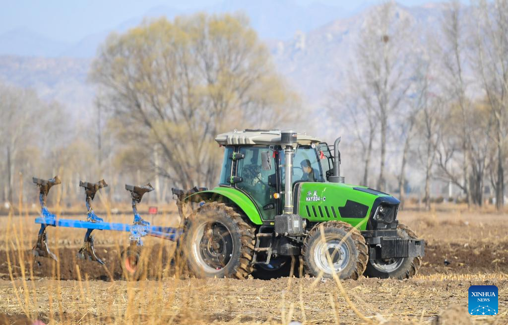 Farmers loosen soil with a machine in Hohhot, north China's Inner Mongolia Autonomous Region, March 30, 2022. (Xinhua/Peng Yuan)