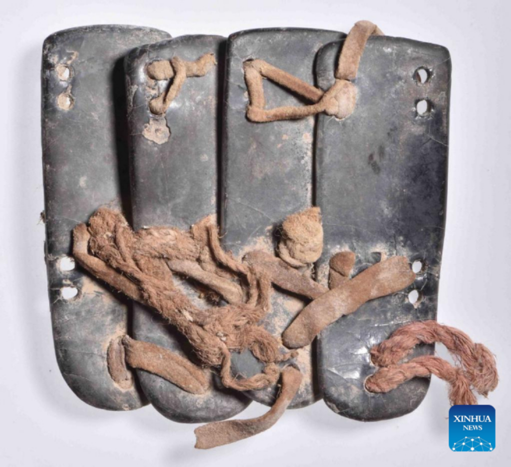 File photo shows a piece of armour unearthed from the Keyakekuduke Watchtower Site in Yuli County, northwest China's Xinjiang Uygur Autonomous Region.