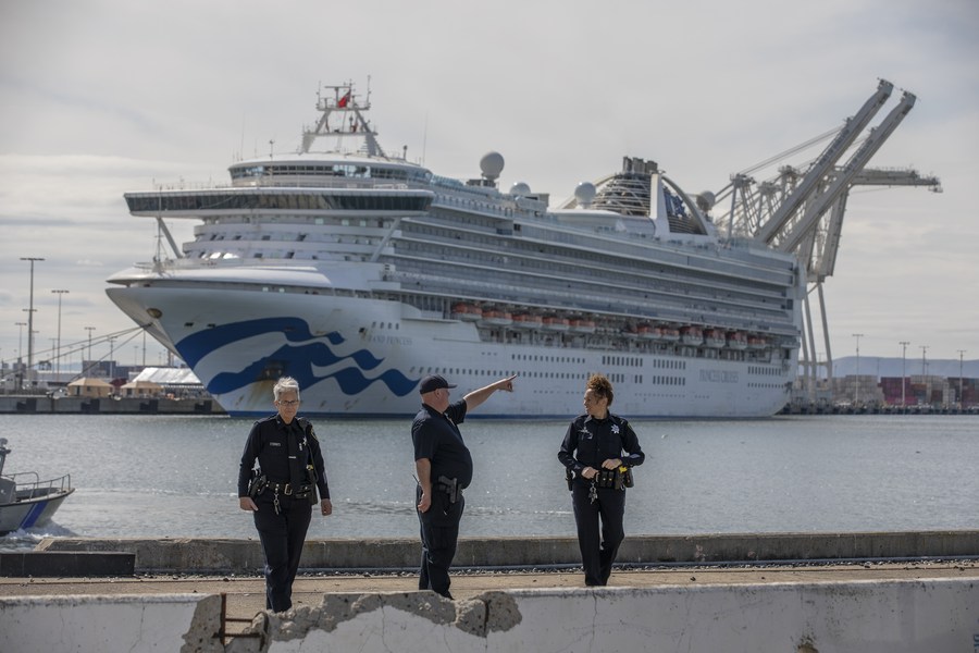 File photo taken on March 9, 2020 shows police standing guard near the Grand Princess cruise ship docking at the Port of Oakland, the United States. The Grand Princess cruise ship that carried thousands of people, including 21 coronavirus patients, docked at the Port of Oakland after being held off at sea for days. (Photo by Li Jianguo/Xinhua)