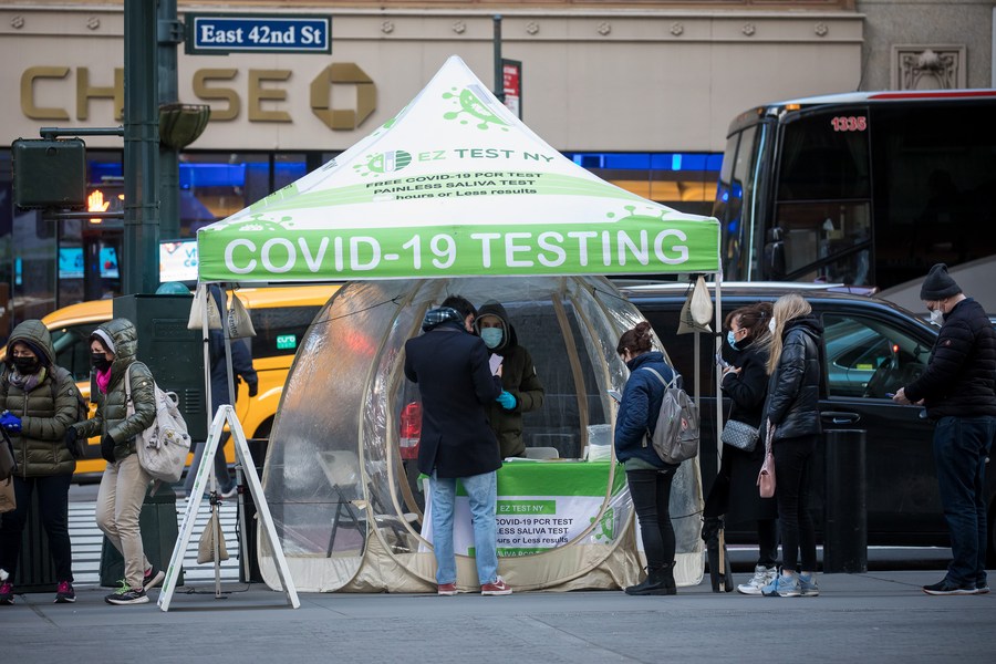 People wait in line at a COVID-19 testing site in New York, the United States, March 28, 2022. (Photo by Michael Nagle/Xinhua)