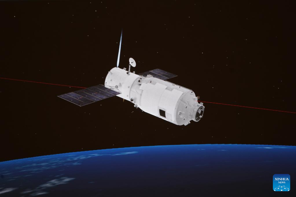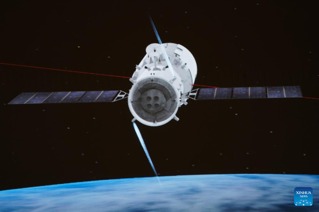 Photo taken at Beijing Aerospace Control Center on March 31, 2022 shows a simulation image of the Tianzhou-2 cargo craft. China's Tianzhou-2 cargo craft entered the Earth's atmosphere under ground control at 6:40 p.m. Beijing Time, the China Manned Space Agency announced on Thursday. Most of the spacecraft burned up during the process, while a small amount of the debris fell into the intended area of safe water in the South Pacific, said the agency. (Xinhua/Guo Zhongzheng)