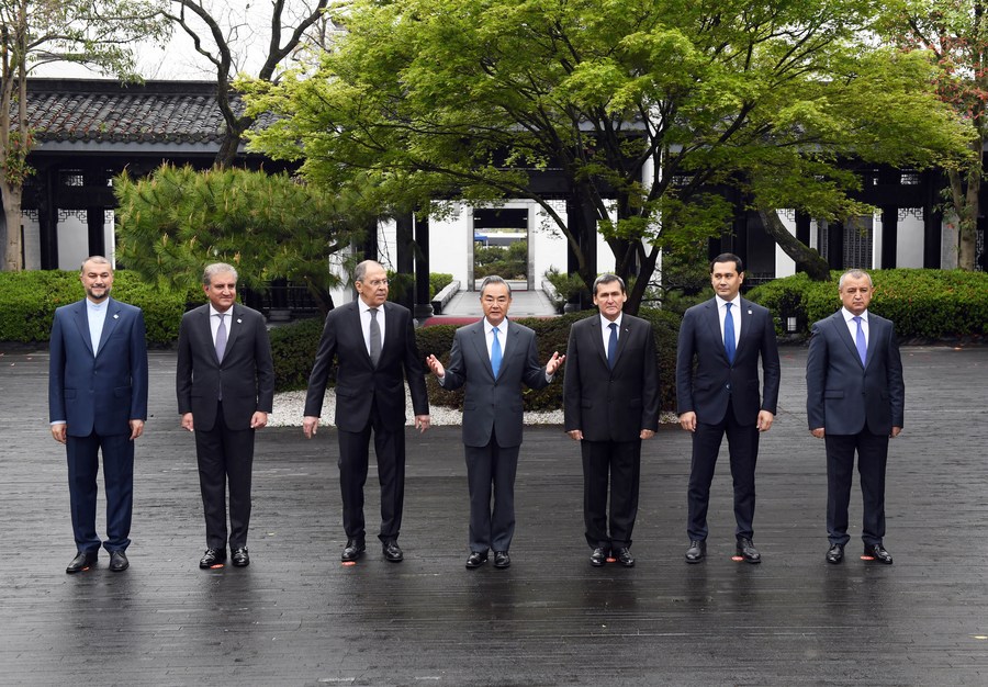 Chinese State Councilor and Foreign Minister Wang Yi chairs the third foreign ministers' meeting of neighboring countries of Afghanistan, in Tunxi, east China's Anhui Province, March 31, 2022. (Xinhua/Zhou Mu)