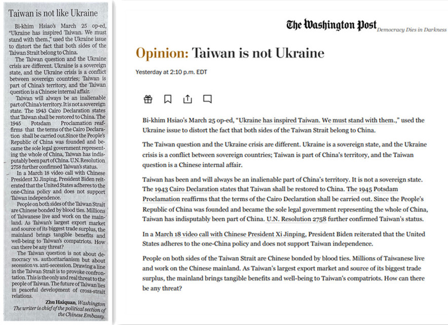 Sent by Minister Counselor Zhu Haiquan, chief of the political section of the Chinese embassy, the letter -- part of which appeared in the Opinion section of The Post's website - was a solemn response to the op-ed authored by Bi-khim Hsiao dated March 24 and titled "Ukraine has inspired Taiwan. We must stand against authoritarianism," which used the Ukraine issue to distort the fact that both sides of the Taiwan Strait belong to one and the same China.