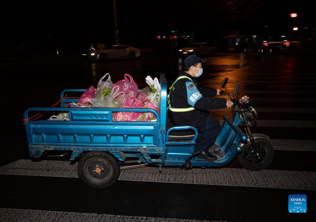 A staff member delivers vegetables at a residential community during night time in east China's Shanghai, March 31, 2022. The second phase of closed-off management in Shanghai has come into force in areas west of the Huangpu River on Friday amid a recent spike in COVID-19 infections, according to local authorities. As scheduled, nucleic acid testing will be held from Friday to April 5 for around 16 million people, and 12 districts will be put under temporary closed-off management. (Xinhua/Jin Liwang)