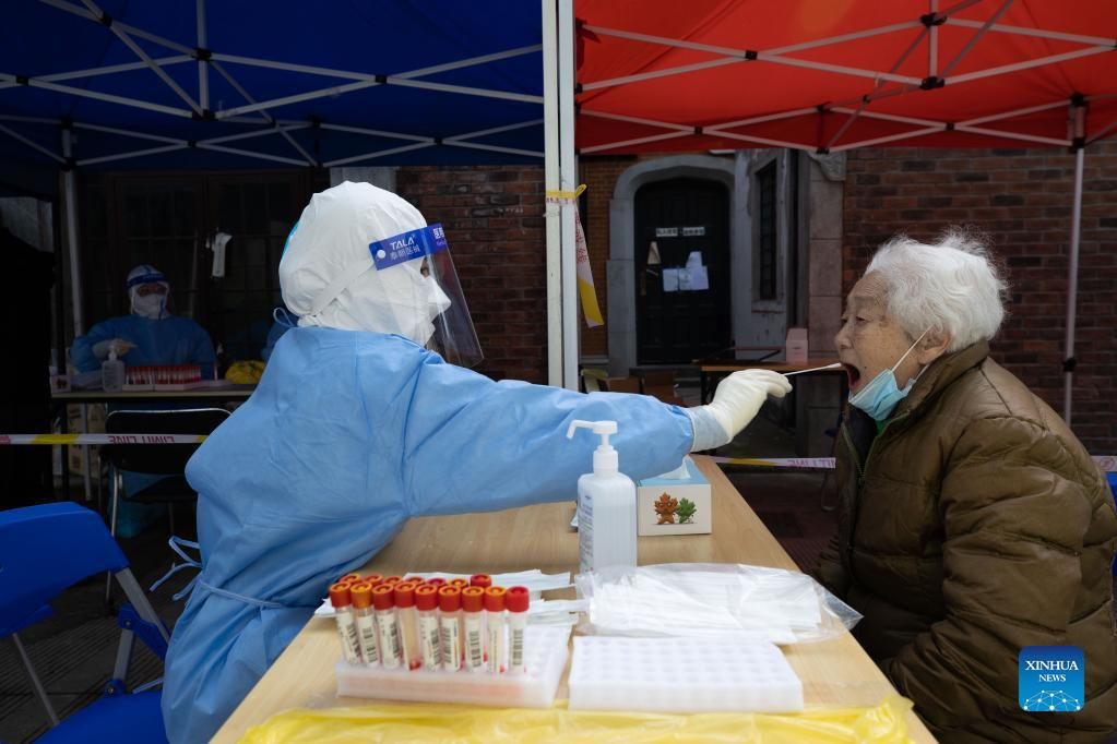 A medical worker takes a swab sample from a senior citizen for nucleic acid test in Changning District of east China's Shanghai, April 1, 2022. Shanghai has launched a nucleic acid testing campaign in areas west of the Huangpu River from Friday amid the second phase of the city's closed-off management. (Xinhua/Jin Liwang)