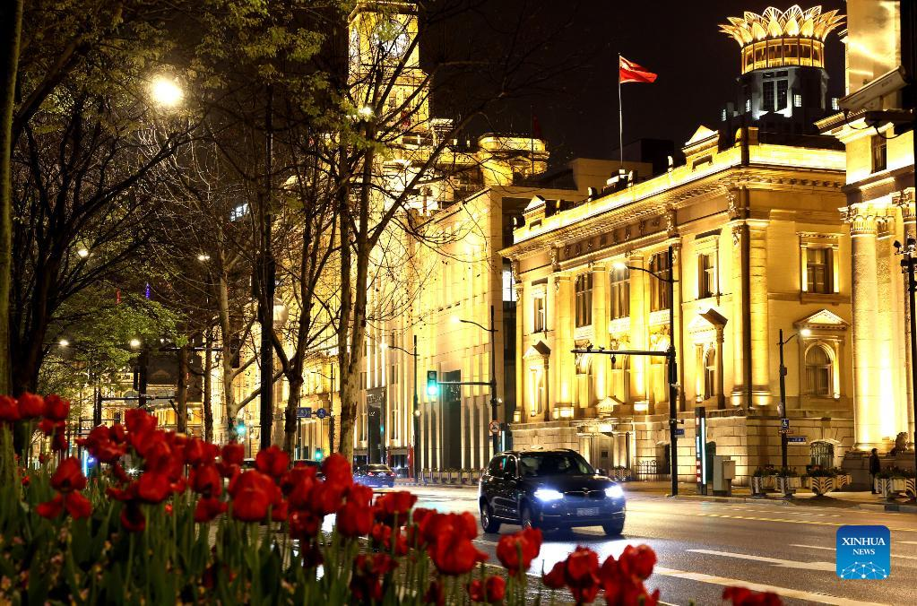 Photo taken on March 31, 2022 shows the night view of the Bund in east China's Shanghai. The second phase of closed-off management in Shanghai has come into force in areas west of the Huangpu River on Friday amid a recent spike in COVID-19 infections, according to local authorities. As scheduled, nucleic acid testing will be held from Friday to April 5 for around 16 million people, and 12 districts will be put under temporary closed-off management. (Xinhua/Chen Fei)