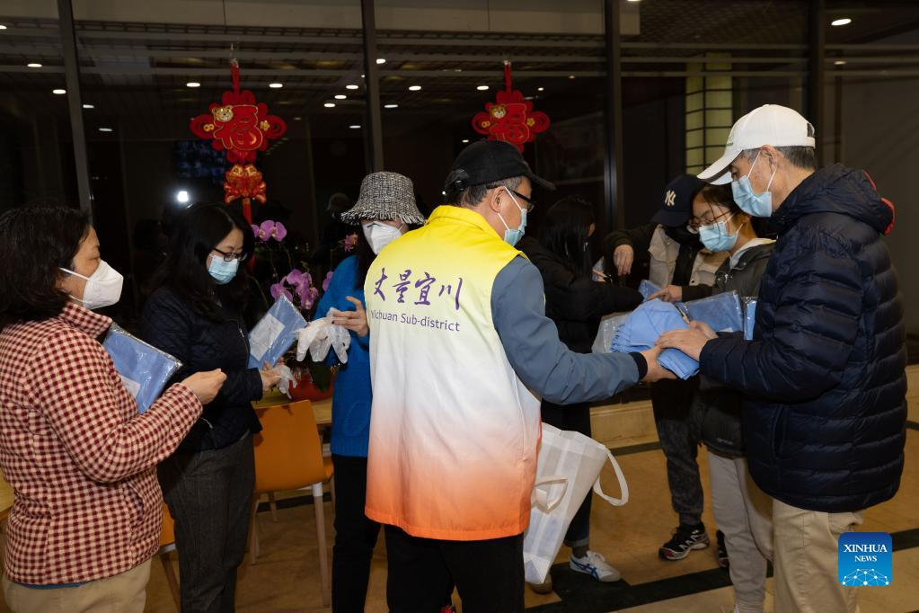 Volunteers guide residents to do nucleic acid test in Putuo District of east China's Shanghai, April 1, 2022. The second phase of closed-off management in Shanghai has come into force in areas west of the Huangpu River on Friday amid a recent spike in COVID-19 infections, according to local authorities. As scheduled, nucleic acid testing will be held from Friday to April 5 for around 16 million people, and 12 districts will be put under temporary closed-off management. (Xinhua/Chen Fei)