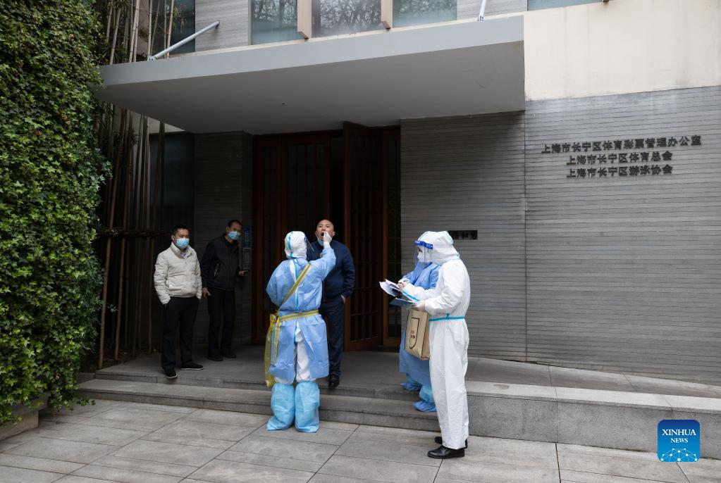 Medical staff take swab samples from residents for nucleic acid test at a residential community in Songjiang District of east China's Shanghai, April 1, 2022. The second phase of closed-off management in Shanghai has come into force in areas west of the Huangpu River on Friday amid a recent spike in COVID-19 infections, according to local authorities. As scheduled, nucleic acid testing will be held from Friday to April 5 for around 16 million people, and 12 districts will be put under temporary closed-off management. (Xinhua/Liu Ying)