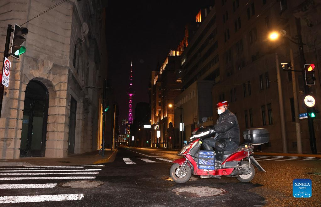 A man rides a motorcycle is seen on Jiujiang Road during night time in east China's Shanghai, March 31, 2022. The second phase of closed-off management in Shanghai has come into force in areas west of the Huangpu River on Friday amid a recent spike in COVID-19 infections, according to local authorities. As scheduled, nucleic acid testing will be held from Friday to April 5 for around 16 million people, and 12 districts will be put under temporary closed-off management. (Xinhua/Chen Fei)