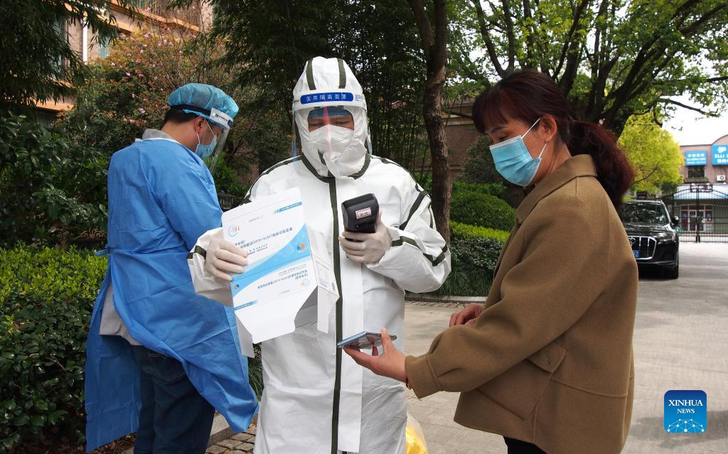 A staff member registers information of a resident to do nucleic acid test at a residential community in Minhang District of east China's Shanghai, April 1, 2022. The second phase of closed-off management in Shanghai has come into force in areas west of the Huangpu River on Friday amid a recent spike in COVID-19 infections, according to local authorities. As scheduled, nucleic acid testing will be held from Friday to April 5 for around 16 million people, and 12 districts will be put under temporary closed-off management. (Xinhua/Ren Long)