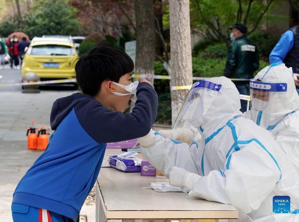 A medical worker takes a swab sample from a boy for nucleic acid test in Songjiang District of east China's Shanghai, April 1, 2022. The second phase of closed-off management in Shanghai has come into force in areas west of the Huangpu River on Friday amid a recent spike in COVID-19 infections, according to local authorities. As scheduled, nucleic acid testing will be held from Friday to April 5 for around 16 million people, and 12 districts will be put under temporary closed-off management. (Xinhua/Liu Ying)