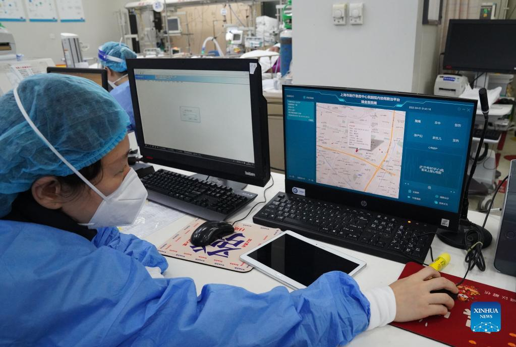A nurse checks on the location of an ambulance online at Ruijin Hospital in east China's Shanghai, April 1, 2022. The second phase of closed-off management in Shanghai has come into force in areas west of the Huangpu River on Friday amid a recent spike in COVID-19 infections, according to local authorities. As scheduled, nucleic acid testing will be held from Friday to April 5 for around 16 million people, and 12 districts will be put under temporary closed-off management. (Xinhua/Yuan Quan)
