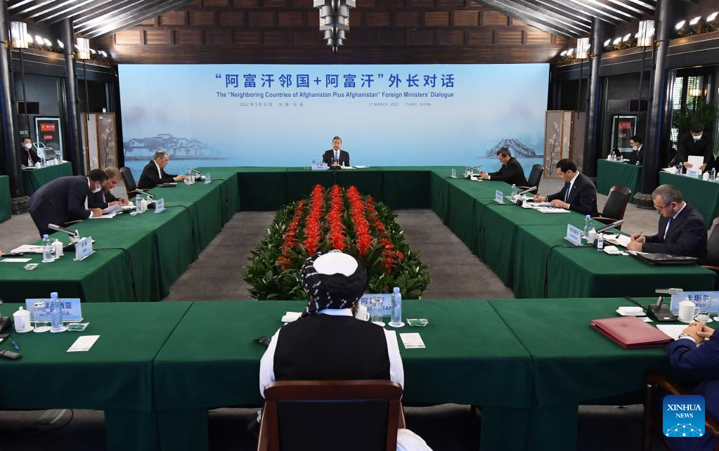 Chinese State Councilor and Foreign Minister Wang Yi chairs the "Afghanistan's neighbors + Afghanistan" foreign ministers' dialogue in Tunxi, east China's Anhui Province, March 31, 2022. Acting Foreign Minister of the Afghan Interim Government Amir Khan Muttaqi was in attendance alongside foreign ministers and representatives of member states of the mechanism of coordination and cooperation among Afghanistan's neighboring countries. Qatari Deputy Prime Minister and Foreign Minister Sheikh Mohammed bin Abdulrahman Al Thani and Indonesian Foreign Minister Retno Marsudi were invited as guests. (Xinhua/Zhou Mu)