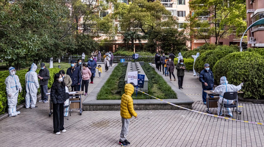 Residents queue to take nucleic acid tests at a community in Hongkou District of east China's Shanghai, April 1, 2022. (Photo by Yang Fan/Xinhua)