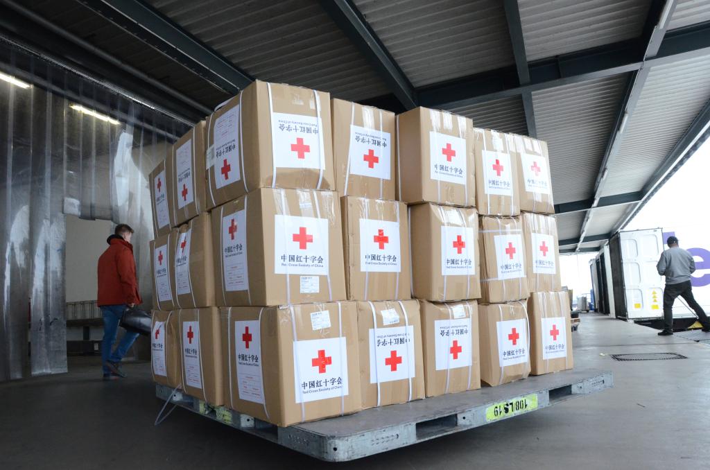 Humanitarian aid supplies sent by the Red Cross Society of China to the Ukrainian Red Cross Society are loaded in Warsaw, Poland, March 15, 2022. (Xinhua/Chen Chen)