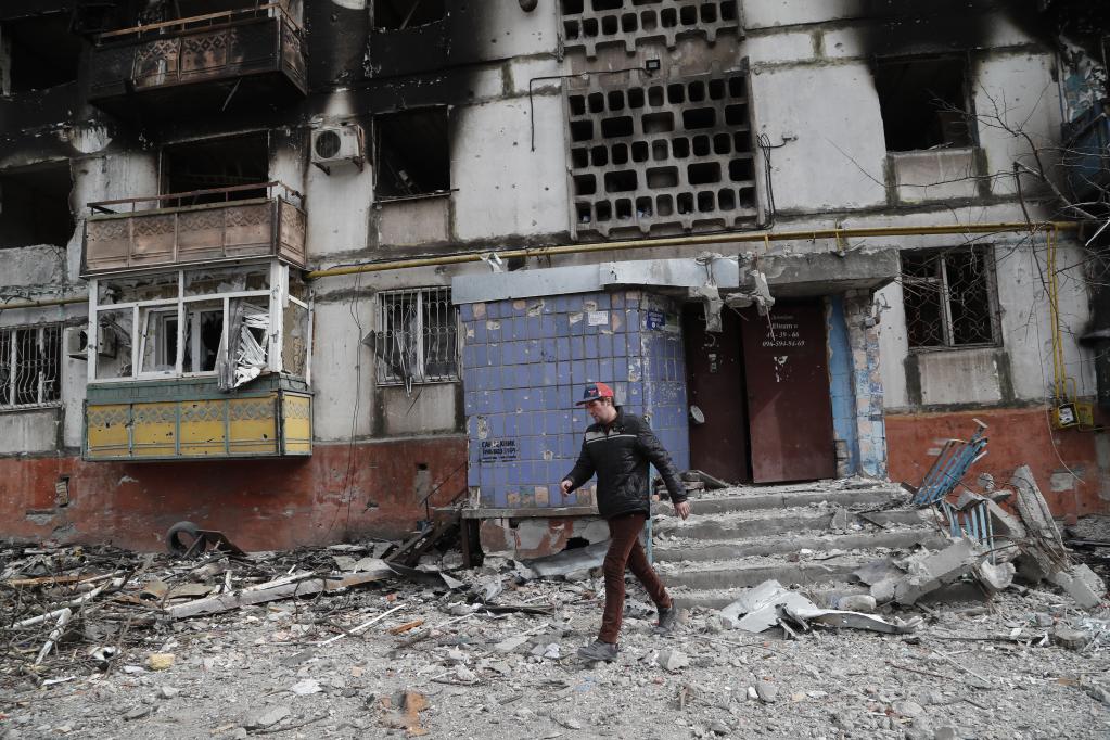 A man walks past a damaged building in Mariupol, April 1, 2022. (Photo by Victor/Xinhua)