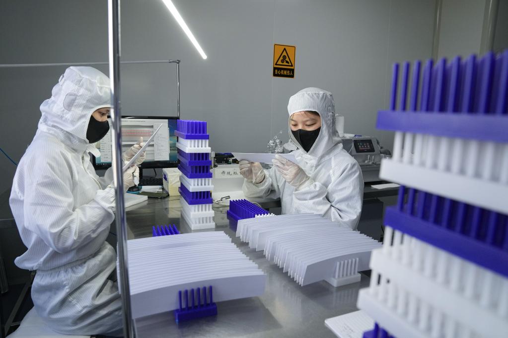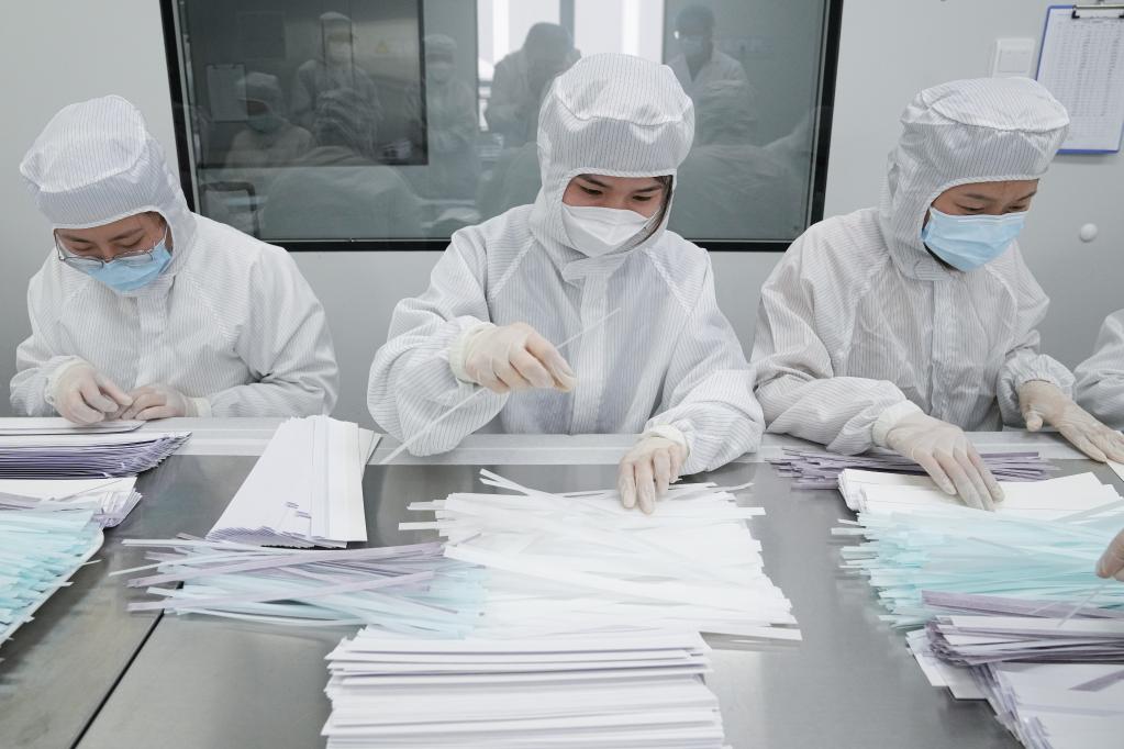 Staff members work at a production line of COVID-19 self-testing kits at Biouhan healthcare company in Hefei, east China's Anhui Province, March 29, 2022. Since March 11, China has added antigen detection as an option for COVID-19 testing among the public. Such kits are already seen in drug stores, online platforms and multiple detection scenarios in China. With a capacity of up to 10 million kits per day, Biouhan healthcare company is a major manufacturer of COVID-19 antigen self-testing kits in east China's Anhui Province. The testing kits have been used in transportation hubs in Hefei, Anhui Province. (Xinhua/Du Yu)