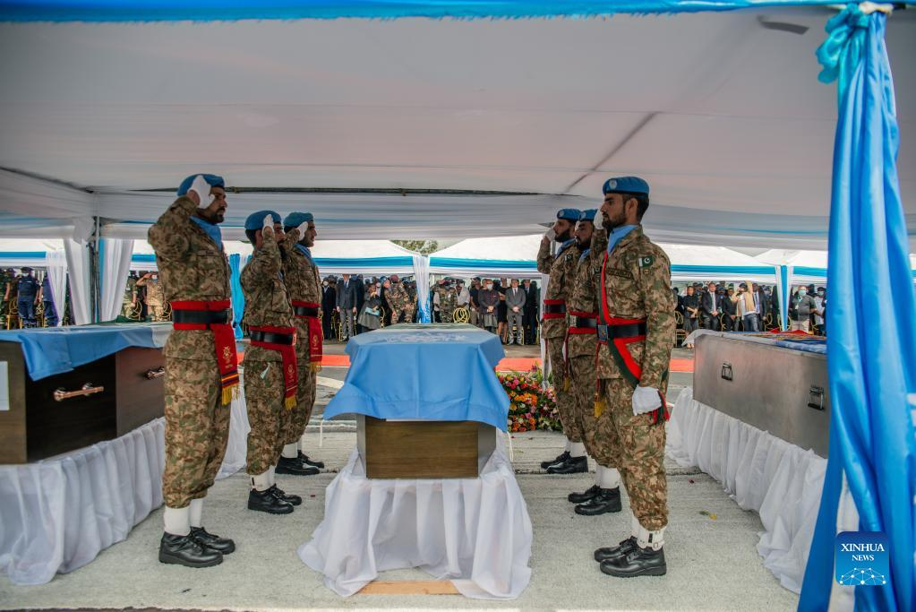Peacekeepers attend a memorial service in Goma, the Democratic Republic of the Congo (DRC), on April 2, 2022. UN peacekeeping mission in the Democratic Republic of the Congo paid a final tribute Saturday to the eight peacekeepers who died during a helicopter crash Tuesday in northeastern DRC. (Photo by Zanem Nety Zaidi/Xinhua)