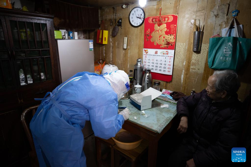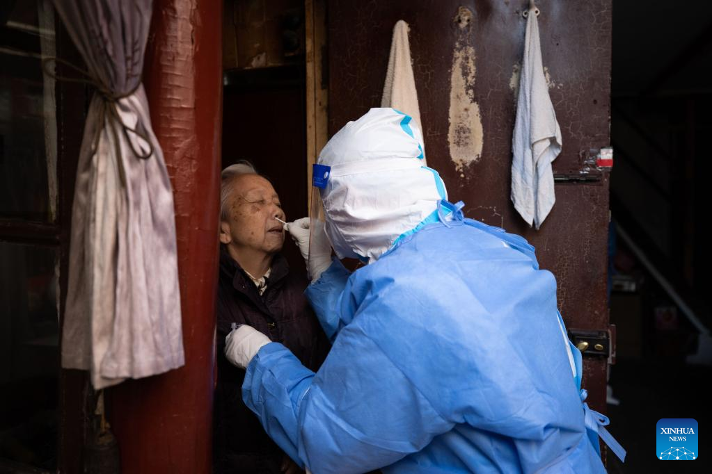 A medical worker conducts antigen testing for an elder resident in Shanghai, east China, April 3, 2022.