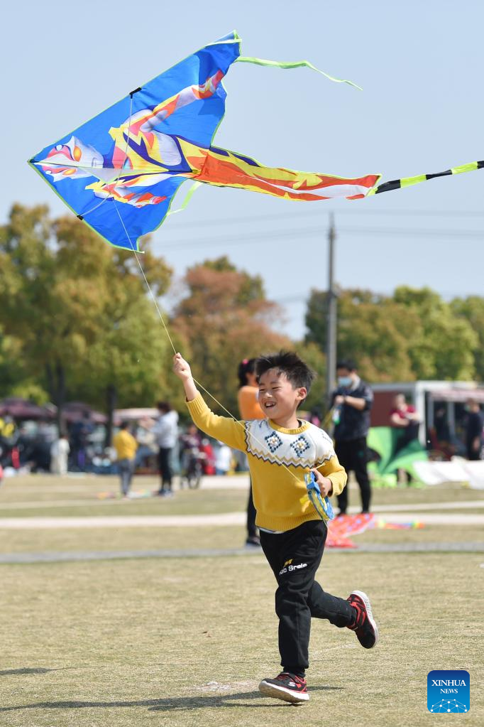A child flies a kite at a wetland park in Nanjing, east China's Jiangsu Province, April 3, 2022. (Photo by Fang Dongxu/Xinhua)