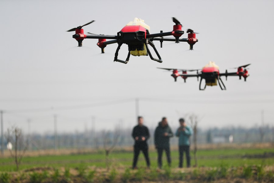 An agricultural technician operates a drone to fertilize seedlings in Hemu Village of Deqing County in Huzhou, east China's Zhejiang Province, Feb. 25, 2022. (Photo by Wang Zheng/Xinhua)