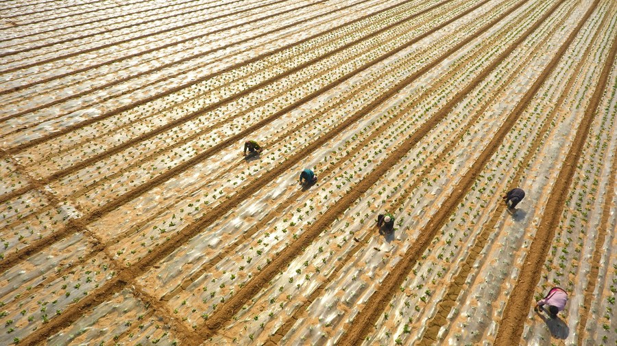 Aerial photo taken on March 28, 2022 shows farmers working in the fields in Xinghuliu Village, Jiazhai Township of Liaocheng City, east China's Shandong Province. (Photo by Zhao Yuguo/Xinhua)