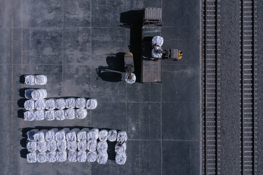 Aerial photo taken on April 1, 2022 shows staff members loading potash fertilizer onto a truck at Qinghai Salt Lake Industry Co., Ltd. in northwest China's Qinghai Province. (Xinhua/Zhang Long)
