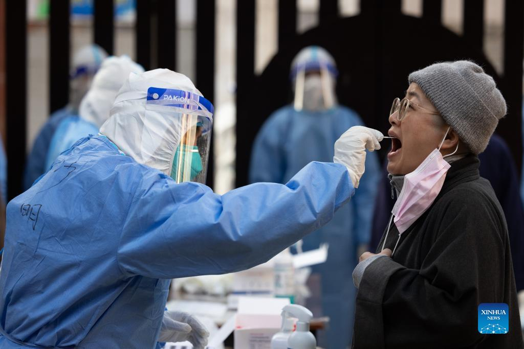 A medical worker from east China's Jiangsu Province takes a swab sample from a resident for nucleic acid test at a community in Xuhui District of Shanghai, east China, April 4, 2022. Amid rising numbers of COVID-19 infections in its latest resurgence, Shanghai on Monday launched a citywide nucleic acid testing campaign covering the city's more than 24 million residents. (Xinhua/Gao Feng)