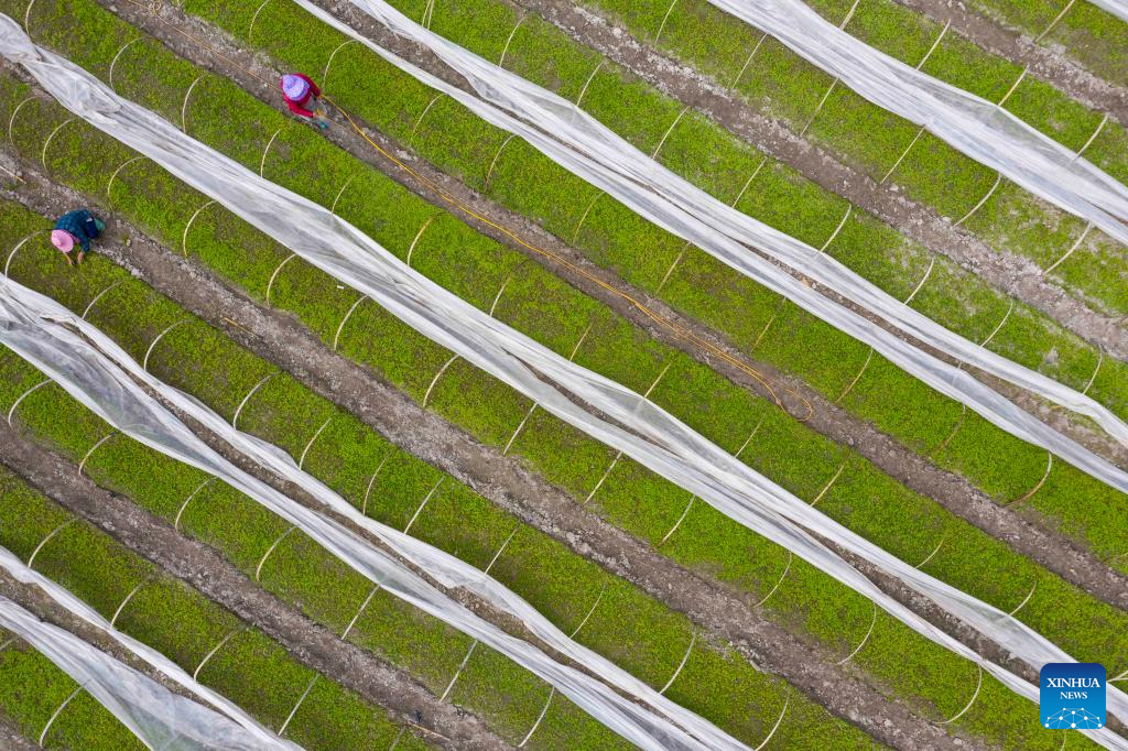 Villagers work at a vegetable base in Xianfeng Village, Tuxi Township, Quxian County of Dazhou, southwest China's Sichuan Province, April 5, 2022. (Photo by Deng Liangkui/Xinhua)