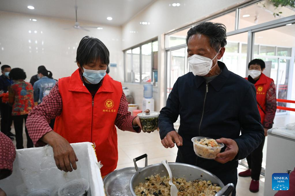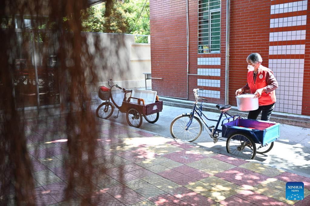 A volunteer granny delivers lunch meals at Xinbu Community in Quanzhou, southeast China's Fujian Province, April 5, 2022.