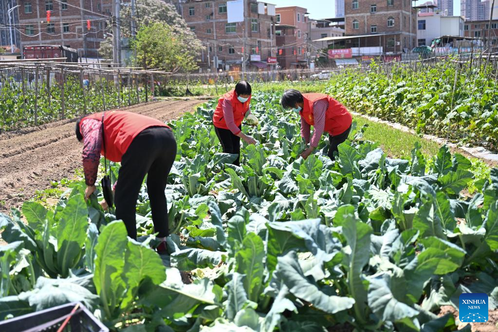 Volunteer grannies pick vegetables for cooking at Xinbu Community in Quanzhou, southeast China's Fujian Province, April 5, 2022.