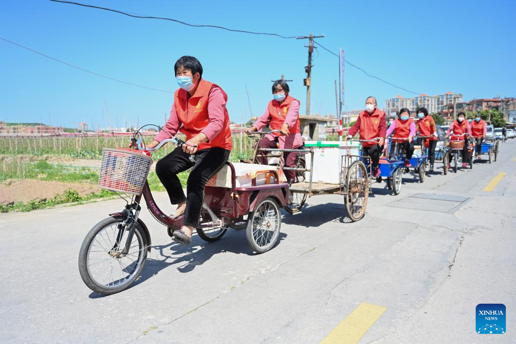 Volunteer grannies ride three-wheelers to deliver lunch for frontline essential workers at Xinbu Community in Quanzhou, southeast China's Fujian Province, April 5, 2022.