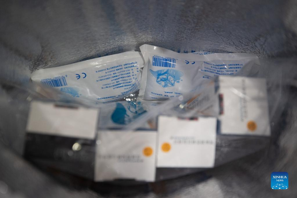 A pharmacist puts medicinal drugs in a bag with ice cubes at the Shanghai Pharma E Pharmacy in Shanghai, east China, April 5, 2022. During the temporary closed-off management period in Shanghai, supply and delivery of special drugs to those patients who need them is particularly important. A pharmacy called Shanghai Pharma E Pharmacy, which sells more than 260 new drugs, special drugs and drugs for rare diseases, stays in business to supply and deliver the medicines. (Xinhua/Jin Liwang)