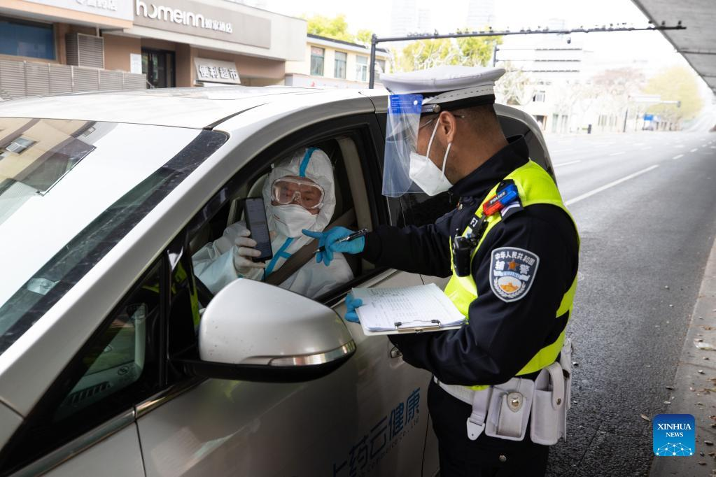A policeman checks the special pass and personal information of the medicine deliveryman Ye Yifei in Shanghai, east China, April 5, 2022. During the temporary closed-off management period in Shanghai, supply and delivery of special drugs to those patients who need them is particularly important. A pharmacy called Shanghai Pharma E Pharmacy, which sells more than 260 new drugs, special drugs and drugs for rare diseases, stays in business to supply and deliver the medicines. (Xinhua/Jin Liwang)