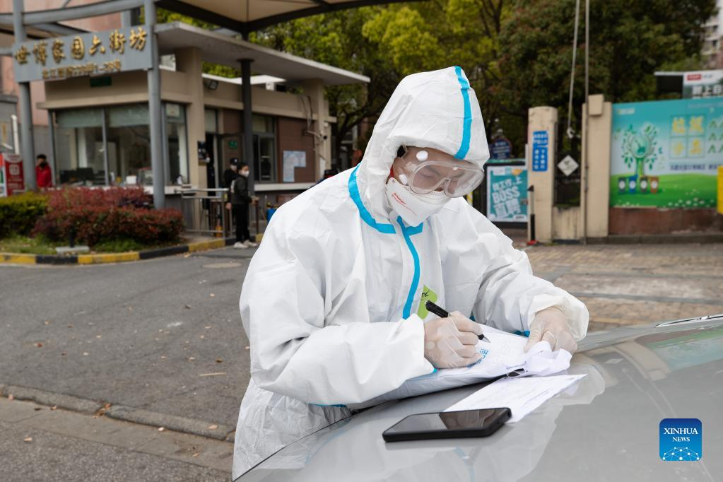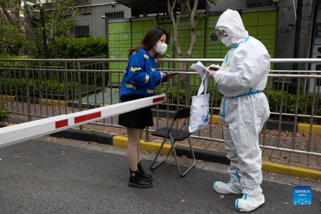 Deliveryman Ye Yifei checks the order information at a community in Shanghai, east China, April 5, 2022. During the temporary closed-off management period in Shanghai, supply and delivery of special drugs to those patients who need them is particularly important. A pharmacy called Shanghai Pharma E Pharmacy, which sells more than 260 new drugs, special drugs and drugs for rare diseases, stays in business to supply and deliver the medicines. (Xinhua/Jin Liwang)