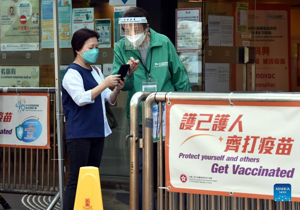 A staff member helps a citizen receive COVID-19 vaccine at a vaccination center in Hong Kong, south China, April 6, 2022. On Wednesday, Hong Kong registered 1,489 new COVID-19 cases by nucleic acid tests, and 1,288 additional cases through self-reported rapid antigen tests, official data showed. (Xinhua/Lo Ping Fai)