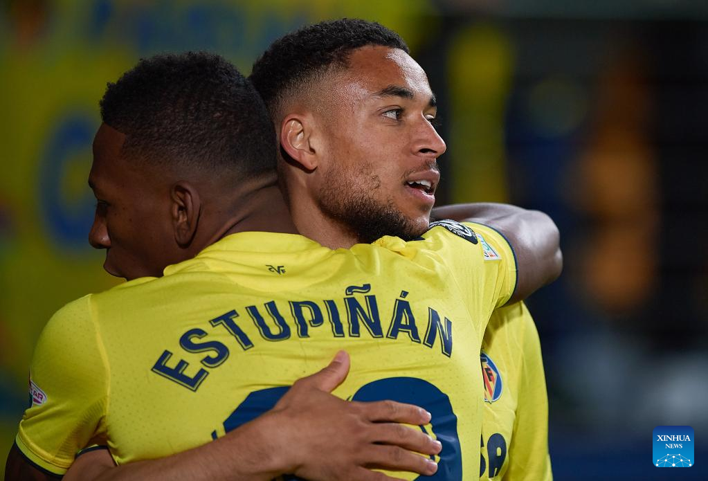 Arnaut Danjuma (R) of Villarreal celebrates a goal with teammate Pervis Estupinan during a UEFA Champions League match between Villarreal CF of Spain and Bayern Munich of Germany at La Ceramica Stadium in Vila-Real, Spain, on April 6, 2022. (str/Xinhua)