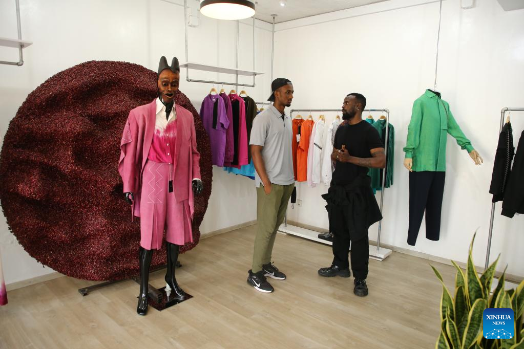 Moses Turahirwa (R), the creative director and founder of Moshions brand, talks with a customer in Moshions shop in Kigali, Rwanda on April 1, 2022. (Photo by Huang Wanqing/Xinhua)