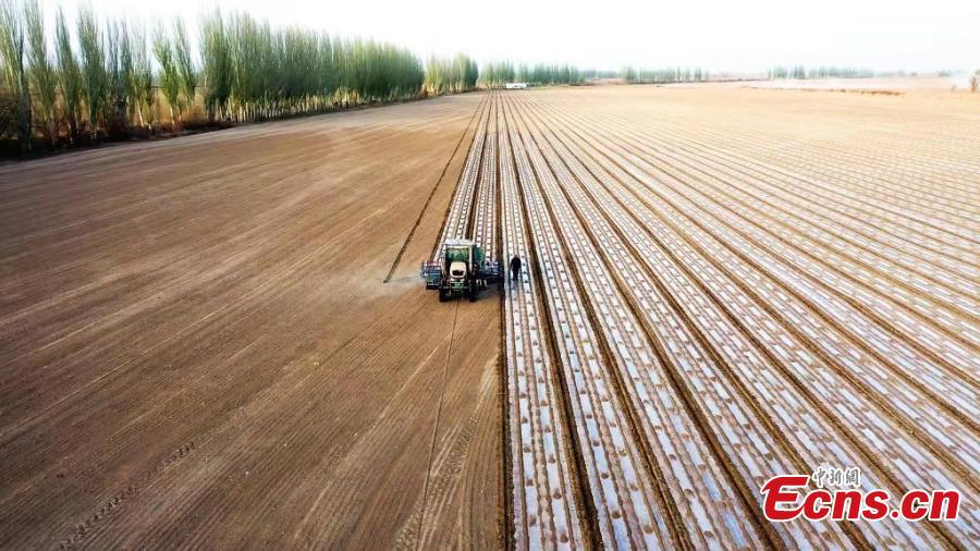 An autonomous crop-sowing vehicle with Beidou navigation system sows cotton seeds in a cotton field, Awat County, northwest China's Xinjiang Uyghur Autonomous Region, April 7, 2022. (Photo/China News Service)