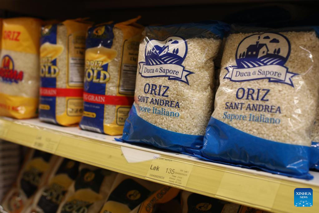 A shelf for rice is seen at a supermarket in Tirana, Albania, April 6, 2022. Due to the rise of energy prices, Albanian markets witnessed the sharp price rise of fuel, cooking oil, flour, etc. (Photo by Gent Onuzi/Xinhua)