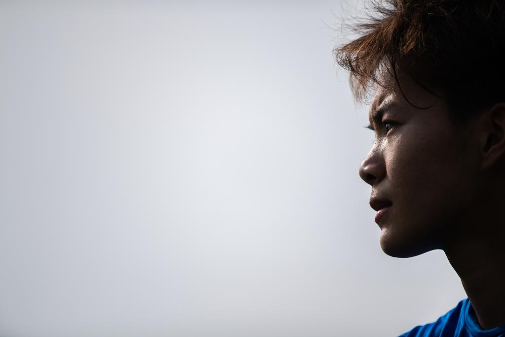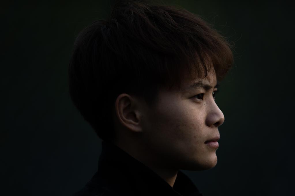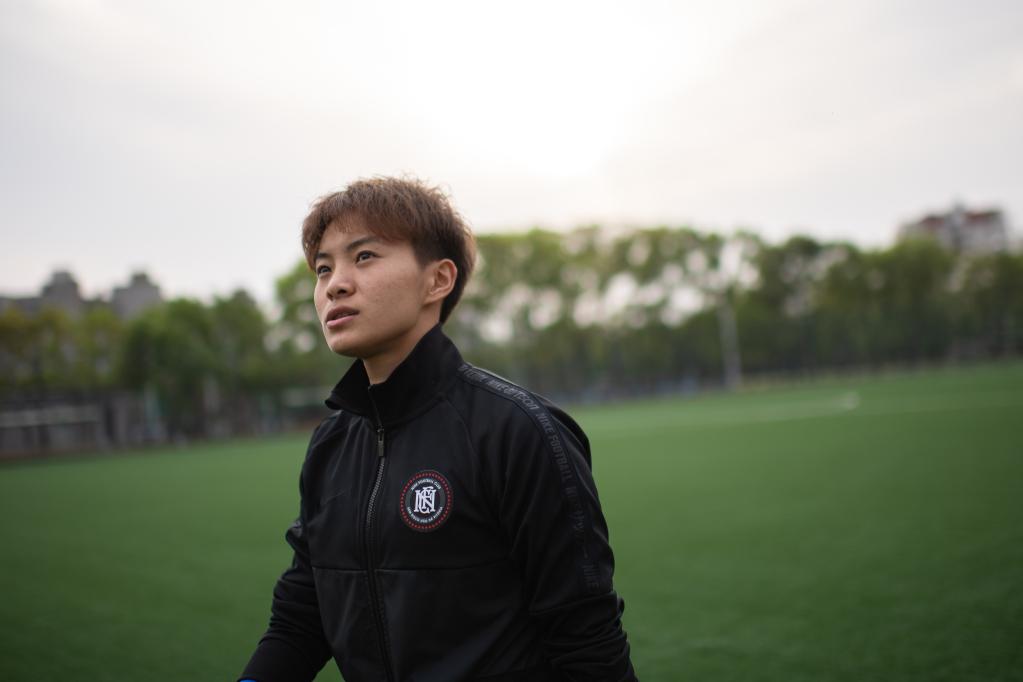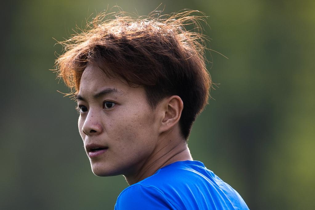 Chinese female football player Wang Shuang reacts after a training session in Wuhan of central China's Hubei Province, on April 6, 2022. (Xinhua/Xiao Yijiu)