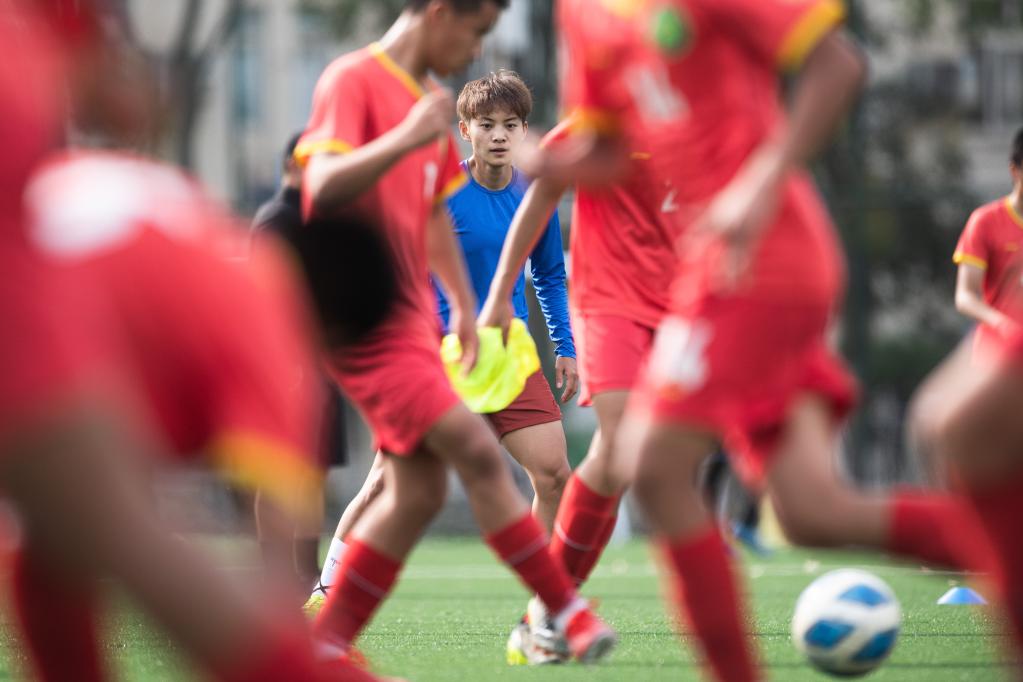Chinese female football player Wang Shuang attends a training session in Wuhan of central China's Hubei Province, on April 6, 2022. (Xinhua/Xiao Yijiu)