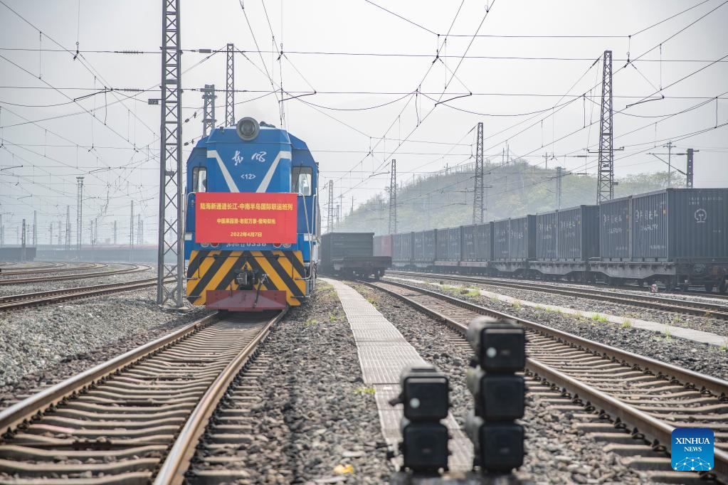 The first outbound international rail-sea freight train from China's Yangtze River to Indo-China Peninsula prepares to leave Guoyuan Port in southwest China's Chongqing Municipality for Myanmar's Yangon, April 7, 2022.