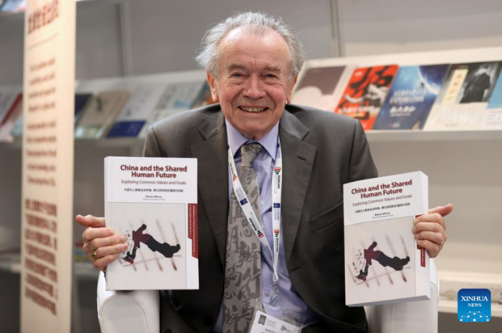 British sociologist Martin Albrow poses for photos with his new book in London, Britain, April 6, 2022. (Xinhua/Li Ying)
