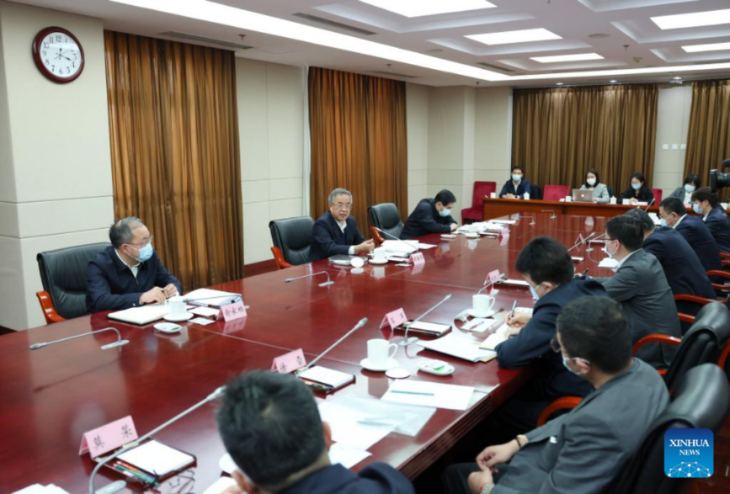 Chinese Vice Premier Hu Chunhua, also a member of the Political Bureau of the Communist Party of China Central Committee, chairs a symposium on the employment situation in Beijing, capital of China, April 7, 2022. (Xinhua/Ding Haitao)