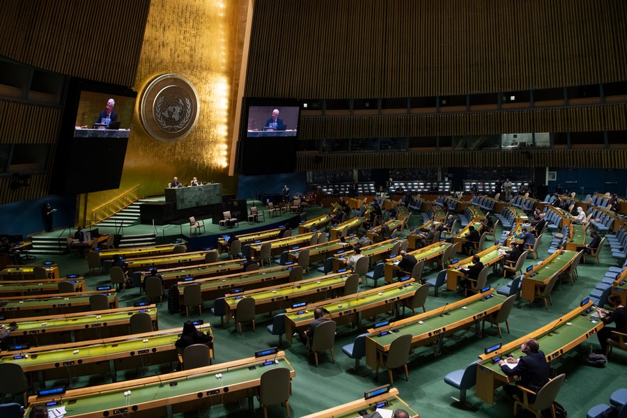 Photo taken on May 5, 2021 shows a wide view of the UNGA Interactive Dialogue to Commemorate and Promote the International Day of Multilateralism and Diplomacy for Peace at the UN headquarters in New York. (Eskinder Debebe/UN Photo/Handout via Xinhua)